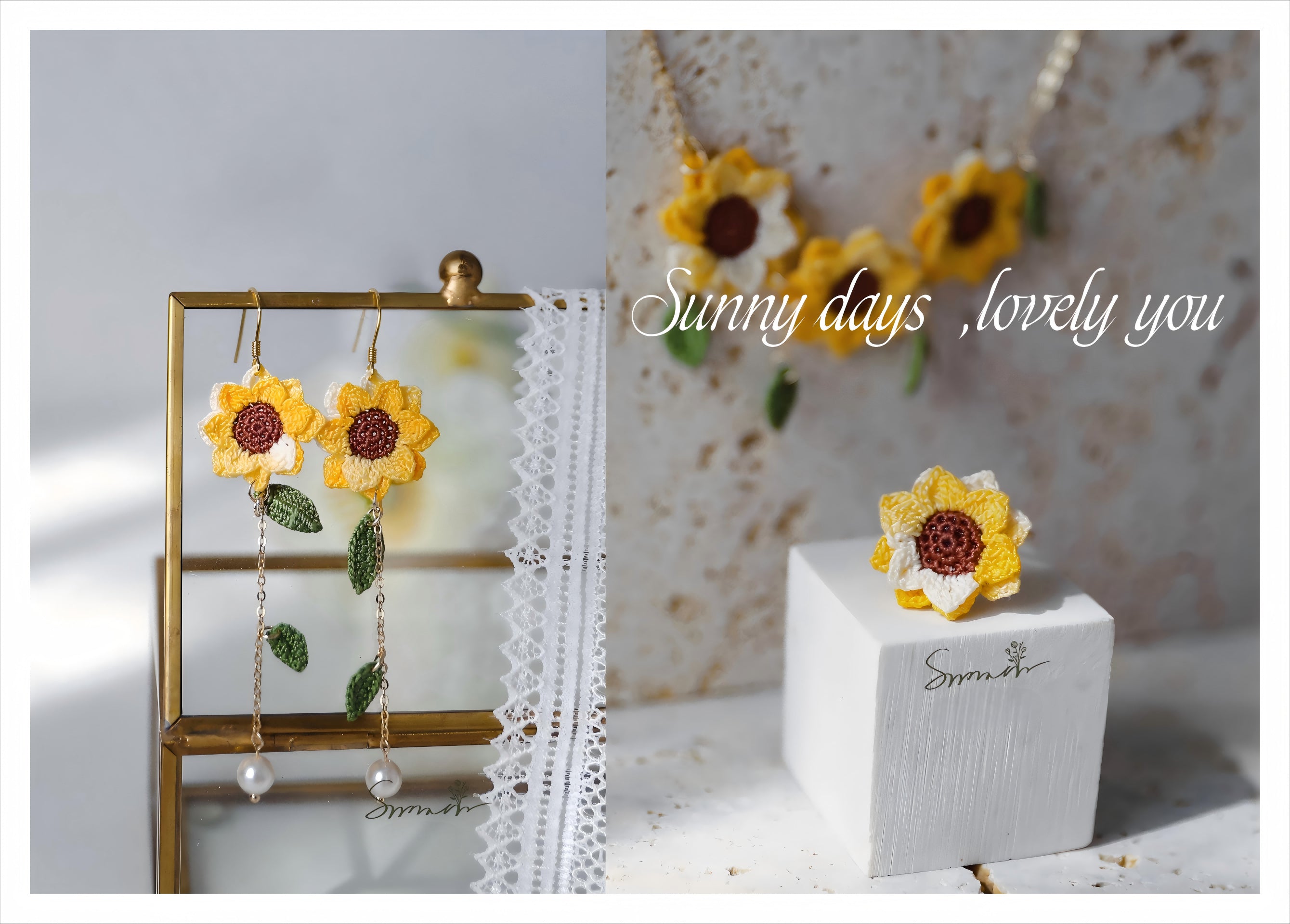 夏のコーデに彩りを添える、手編みひまわりイヤリング。ナチュラルな立体感あるデザインで、耳元をさりげなく華やかに。