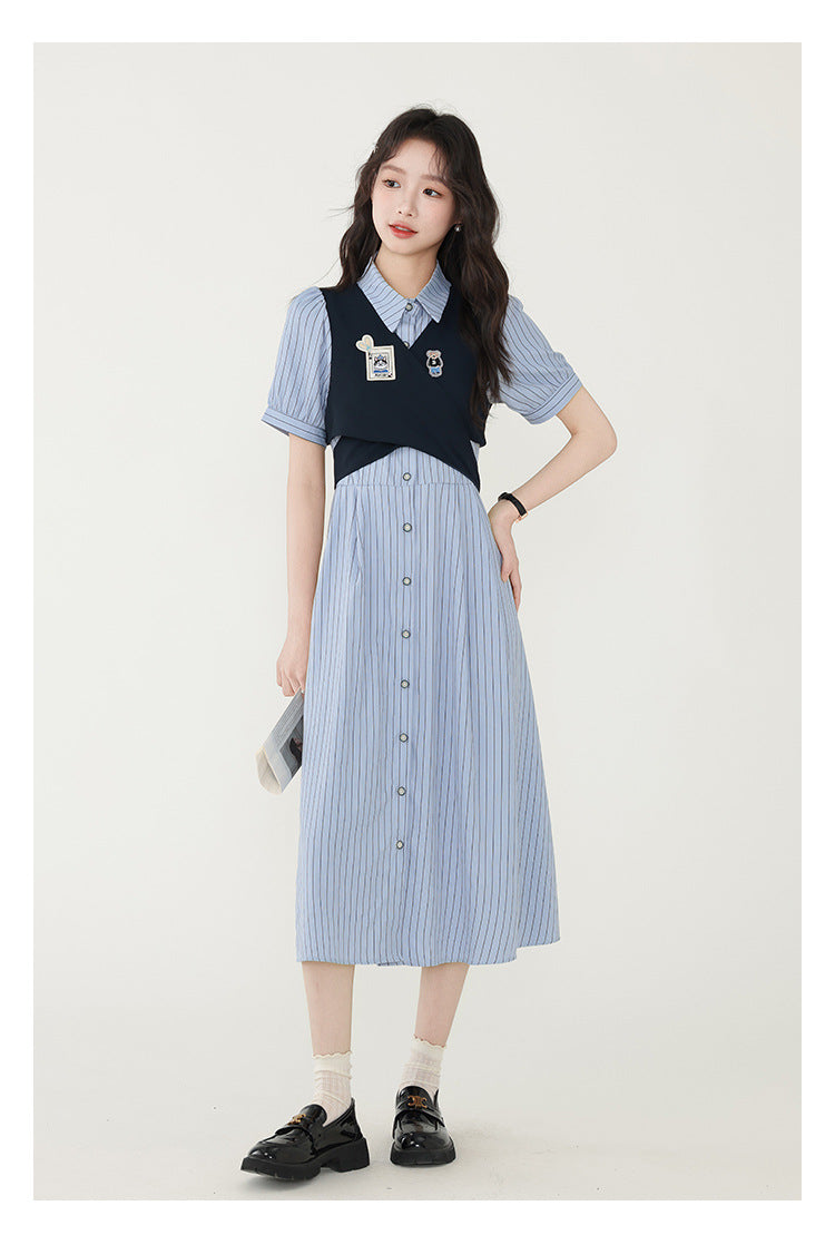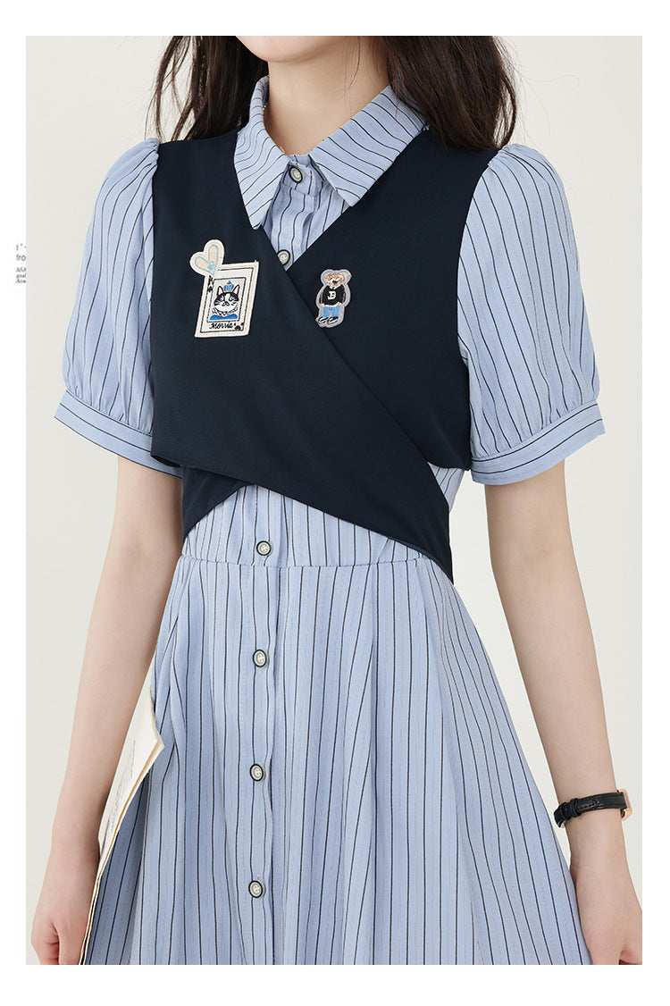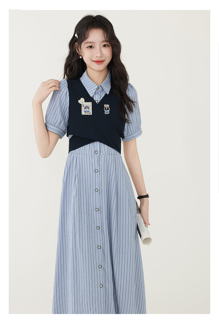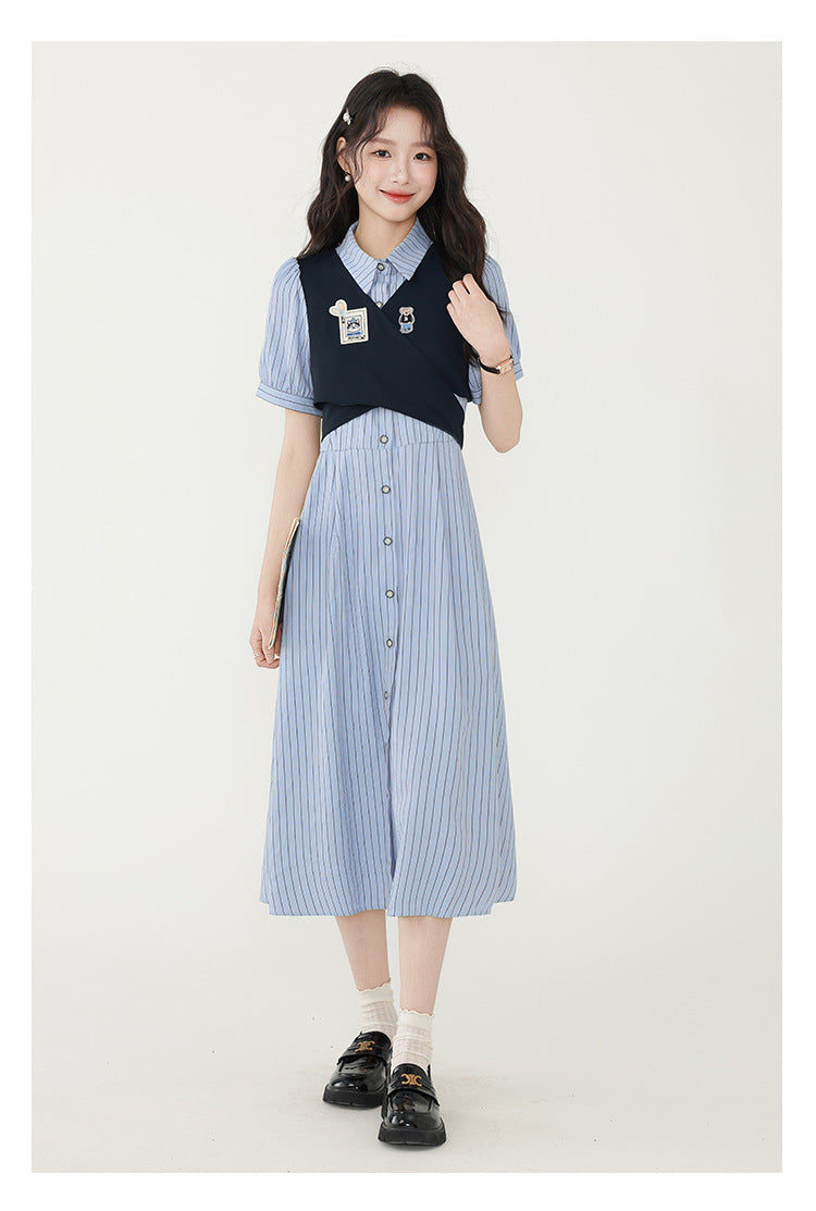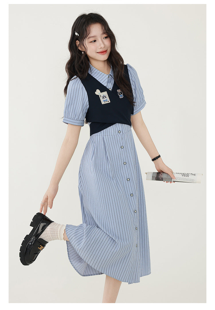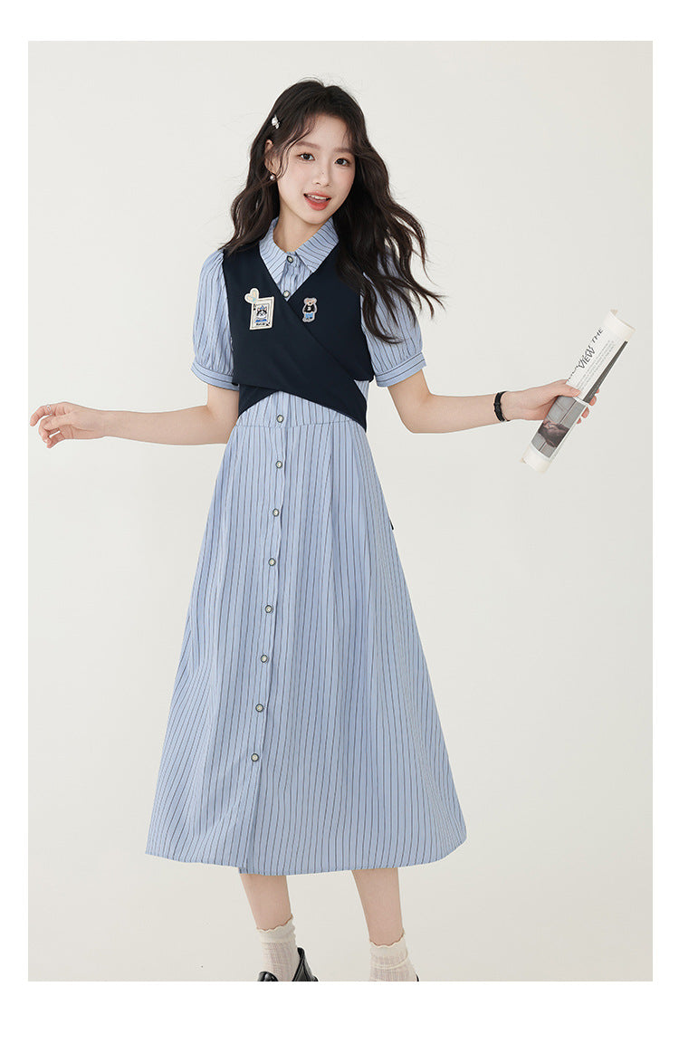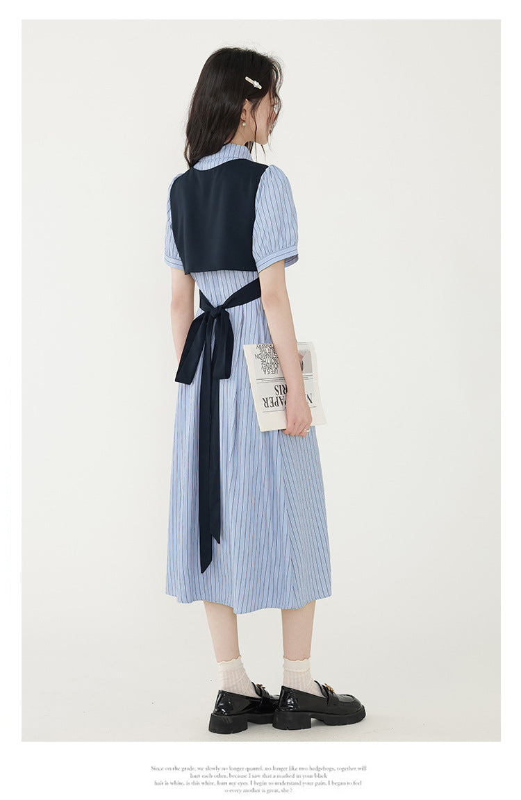 ボタン付きの爽やかなストライプ柄ワンピースに、フェイクベスト風のトップスをドッキングした2025年夏の新作。ウエストは高めの位置で絞られており、脚長効果も抜群。清楚で知的な印象を演出しつつも、通勤にも休日にも着こなせる万能デザインです。