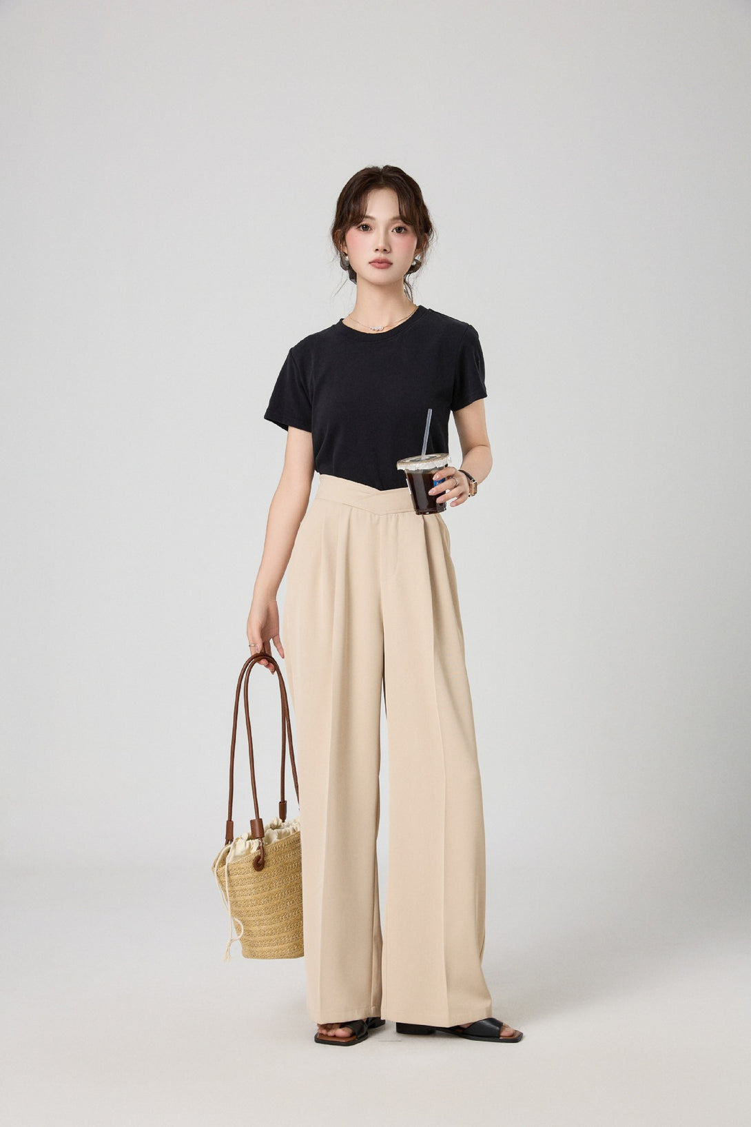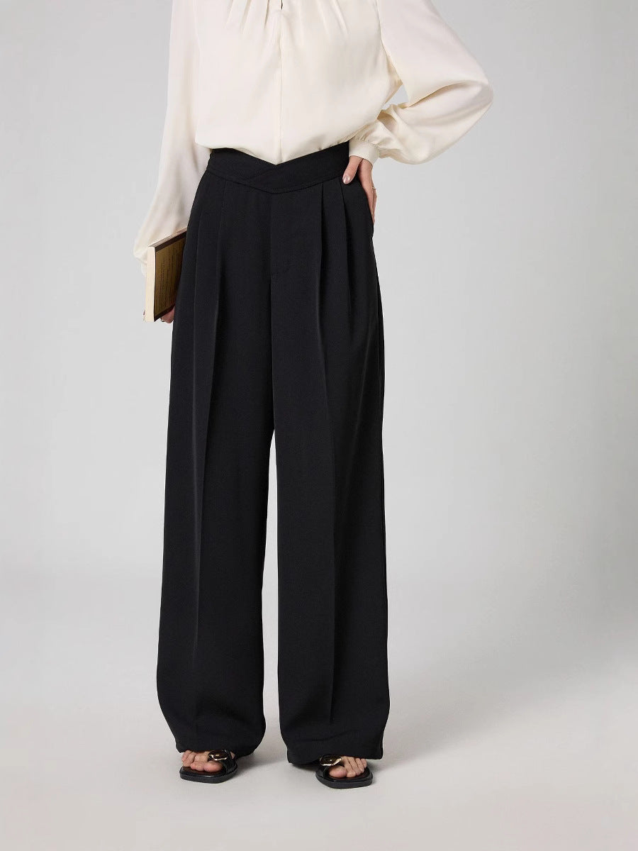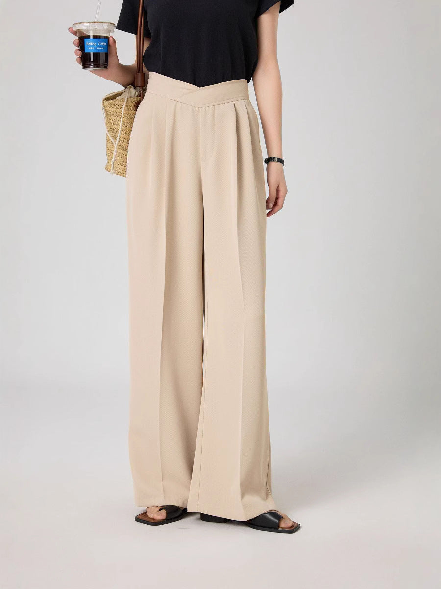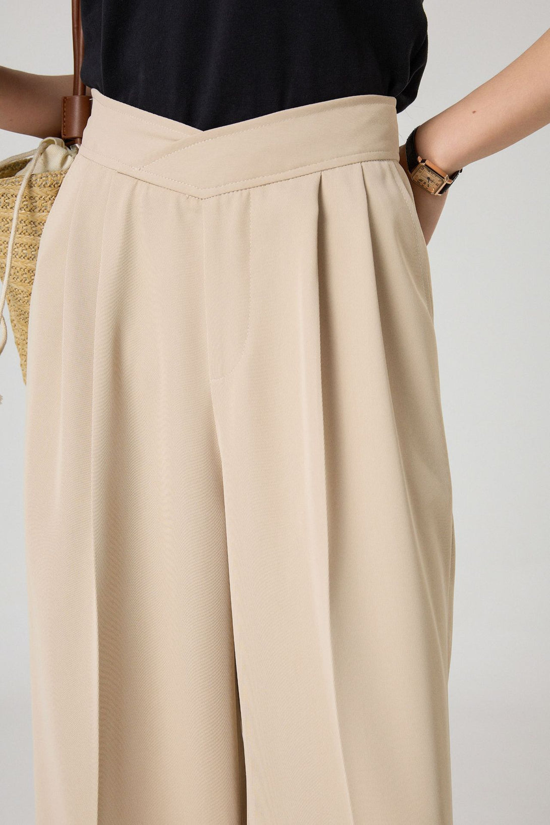 腰回りをすっきり見せるタック入りデザインで、脚長効果も抜群。