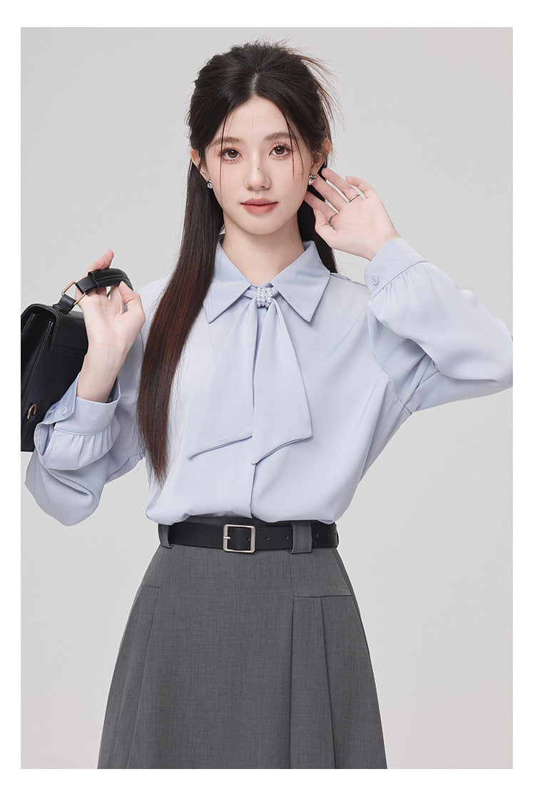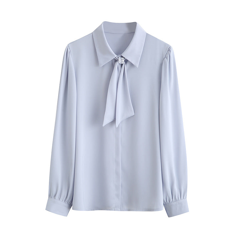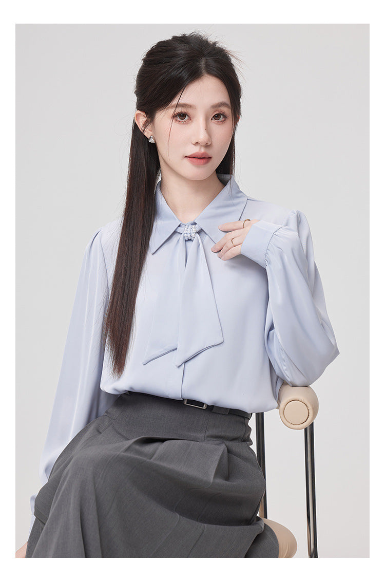 柔らかな素材と光沢感が魅力のブラウスは、パール付きのリボンがワンポイントに。