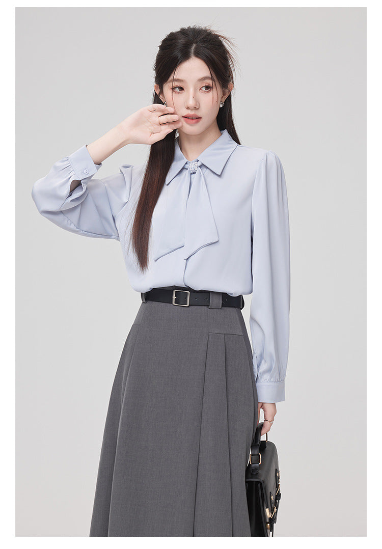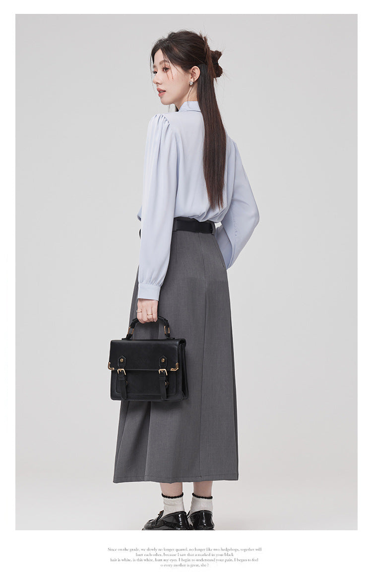 上品で洗練された印象を与える、ライトブルーのブラウスとグレーのAラインスカートのセットアップ。