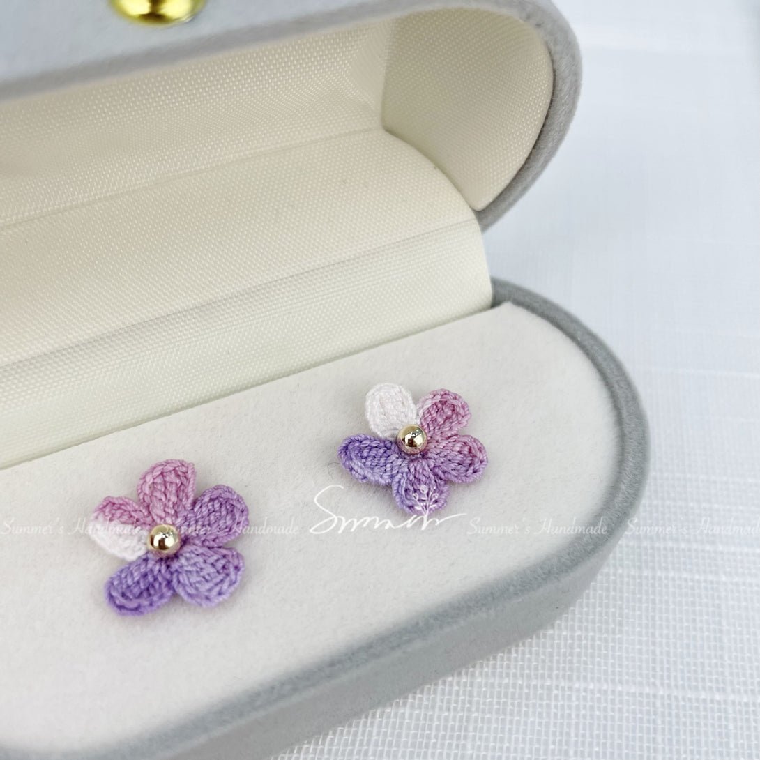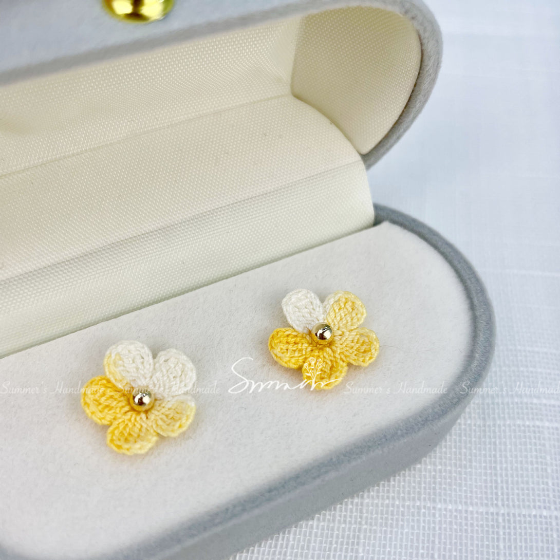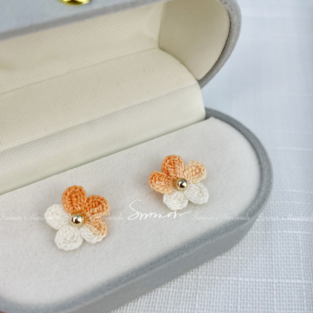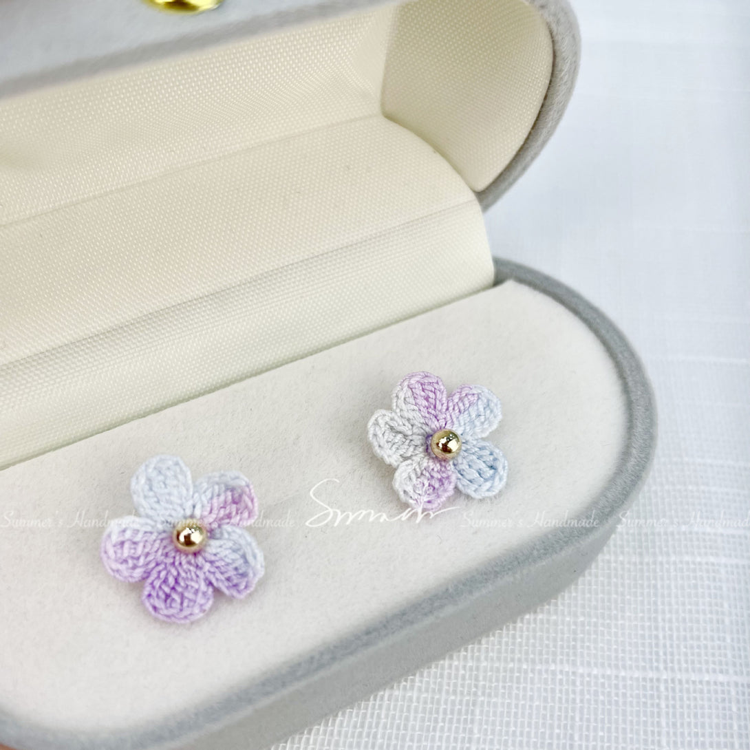 可憐な小花をひとつひとつ丁寧にかぎ針で編み上げた、ハンドメイドのフラワーイヤリングです。