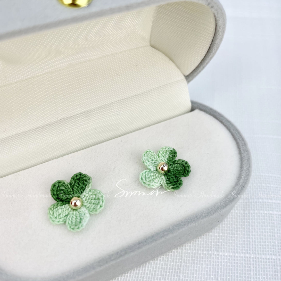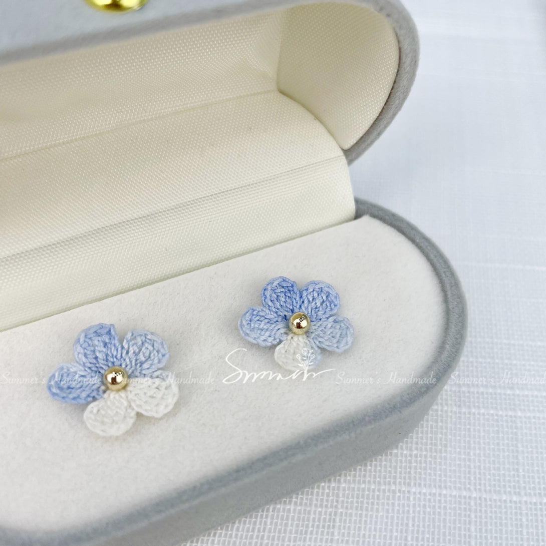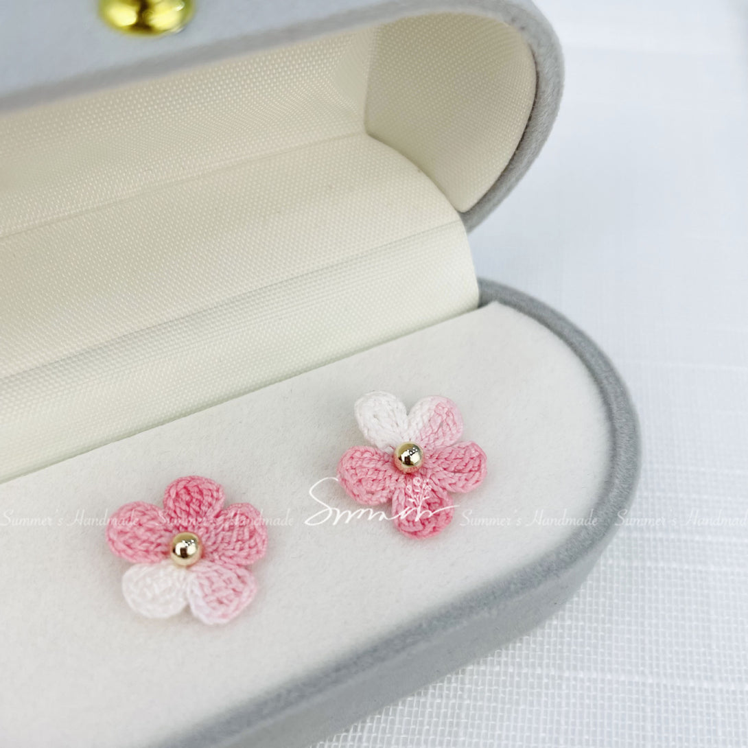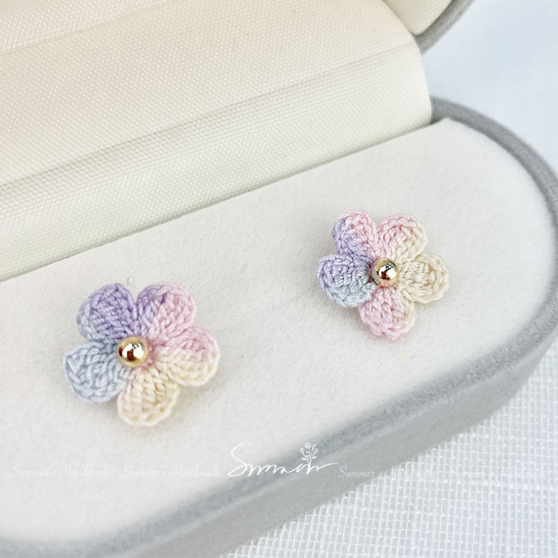 可憐な小花をひとつひとつ丁寧にかぎ針で編み上げた、ハンドメイドのフラワーイヤリングです。