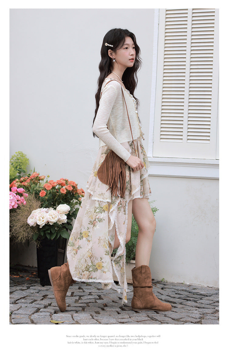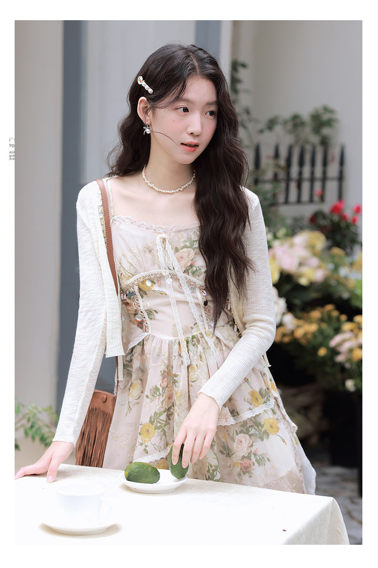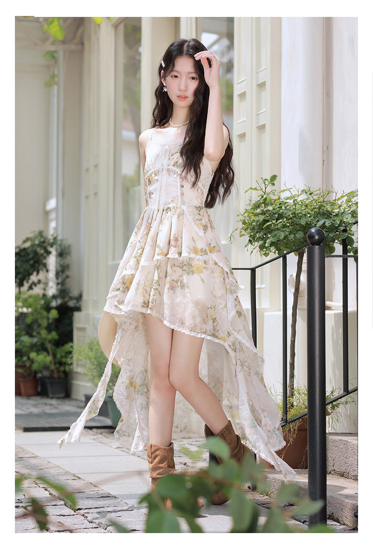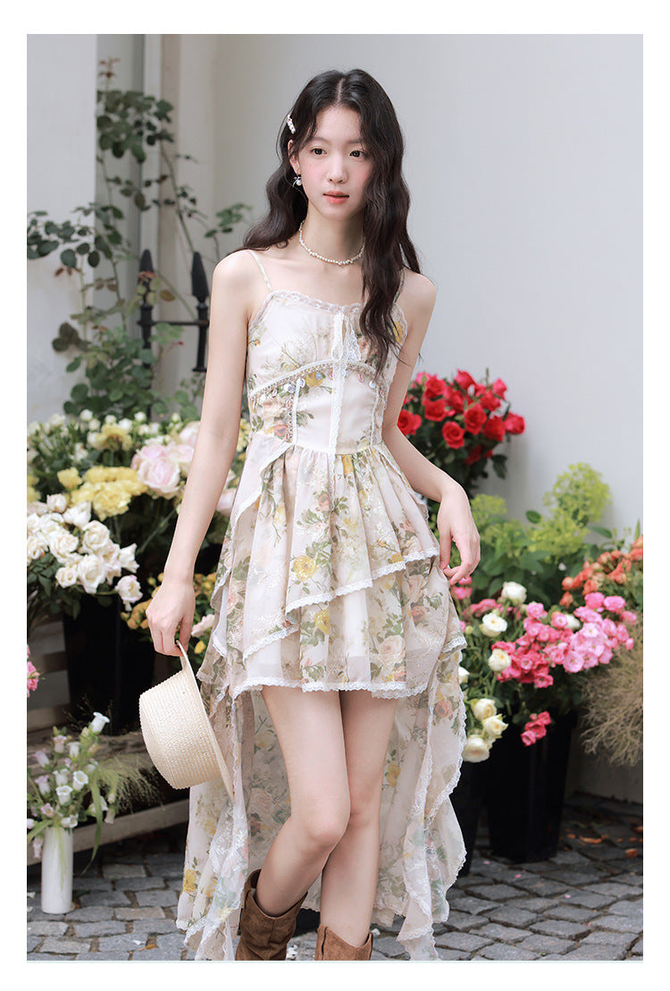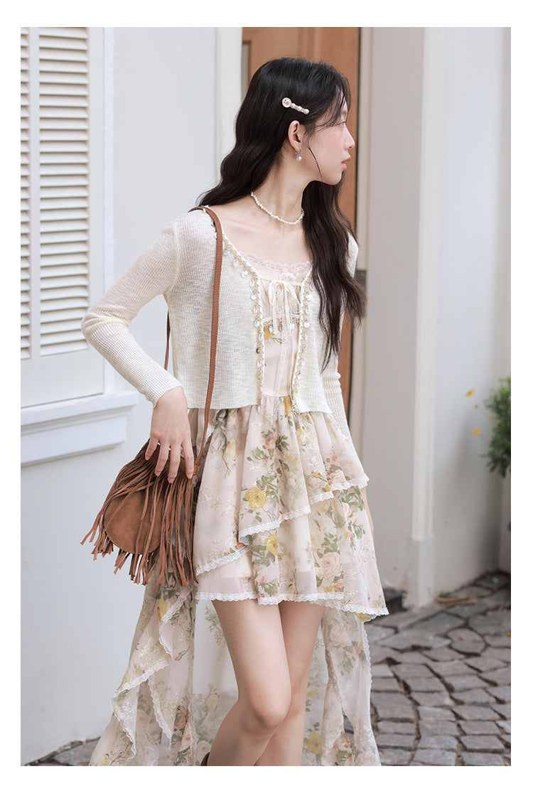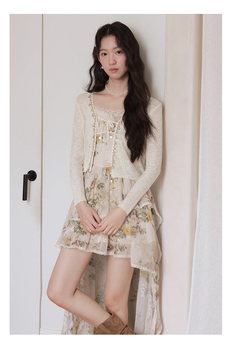 ふんわりとしたシフォン素材の花柄キャミソールワンピースに、同系色の長袖シャツがセットになった2025年夏の新作コーデセット。アシンメトリーな裾とレース縁取りが動きに華やかさをプラスし、視線を惹きつけます。