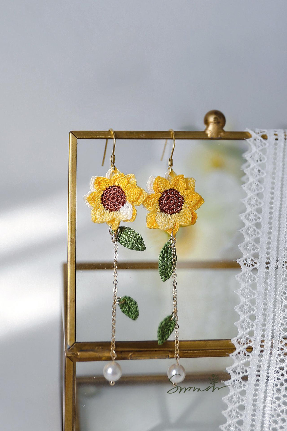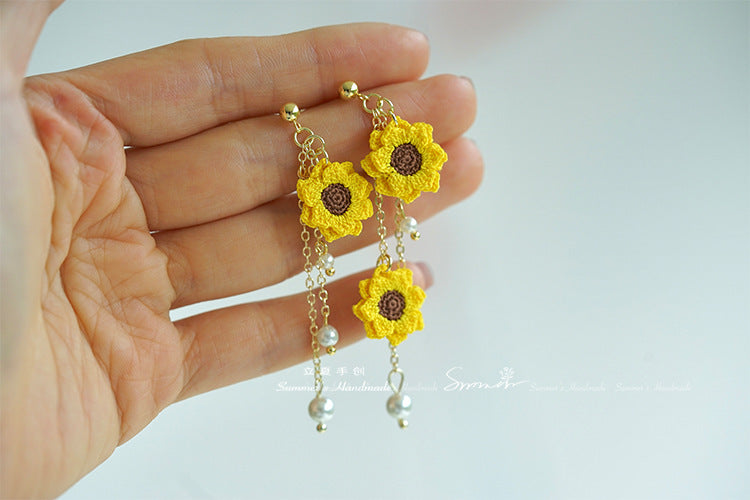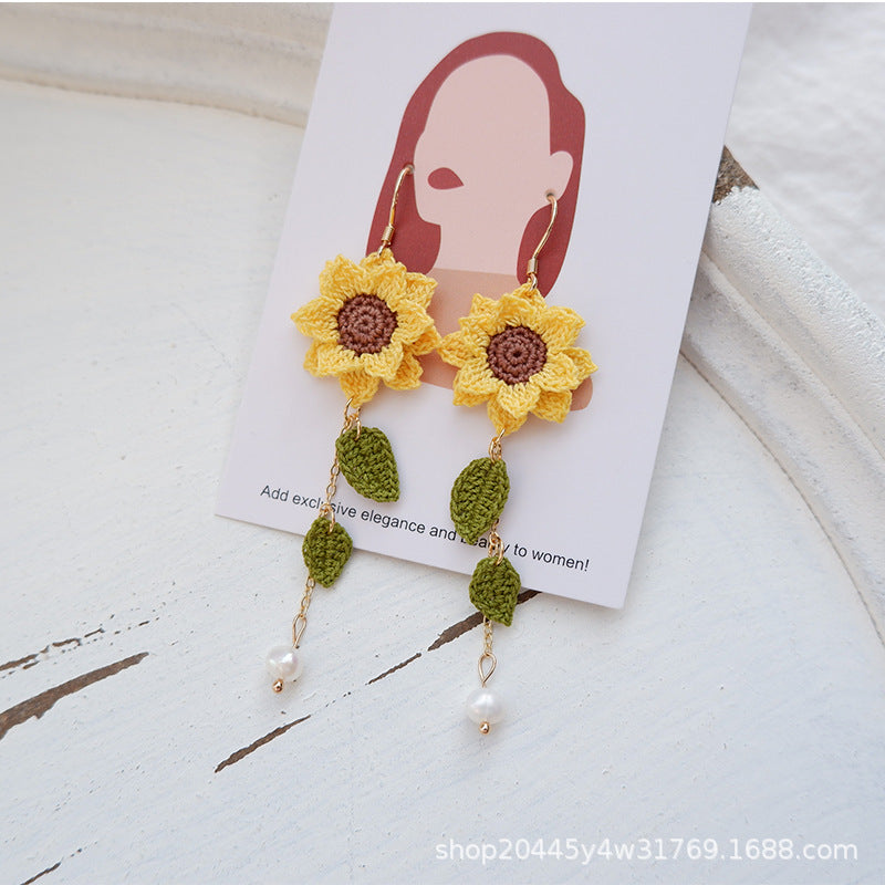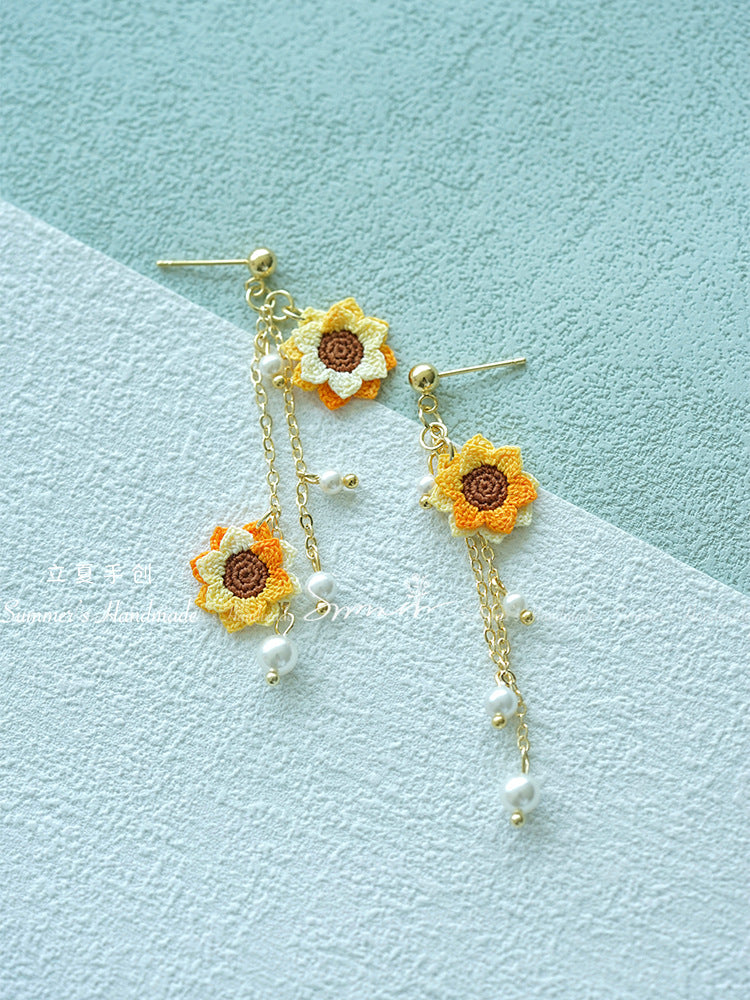 手編みサンフラワーイヤリング(揺れるリーフ&パール付き)